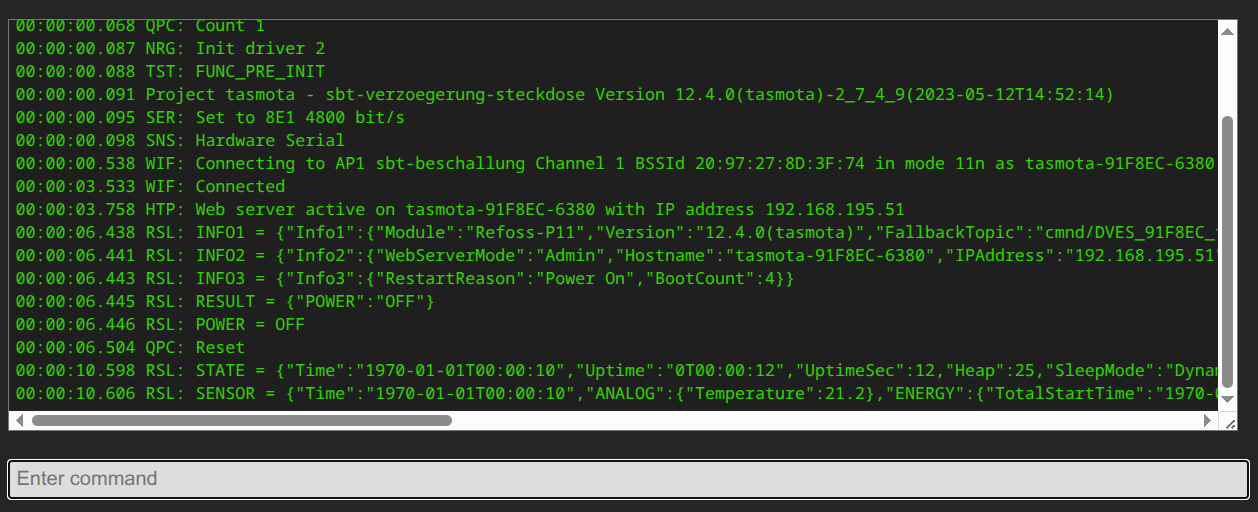 In der Tasmota-Oberfläche sucht man die Console genannte Eingabeaufforderung auf, die sieht so aus: