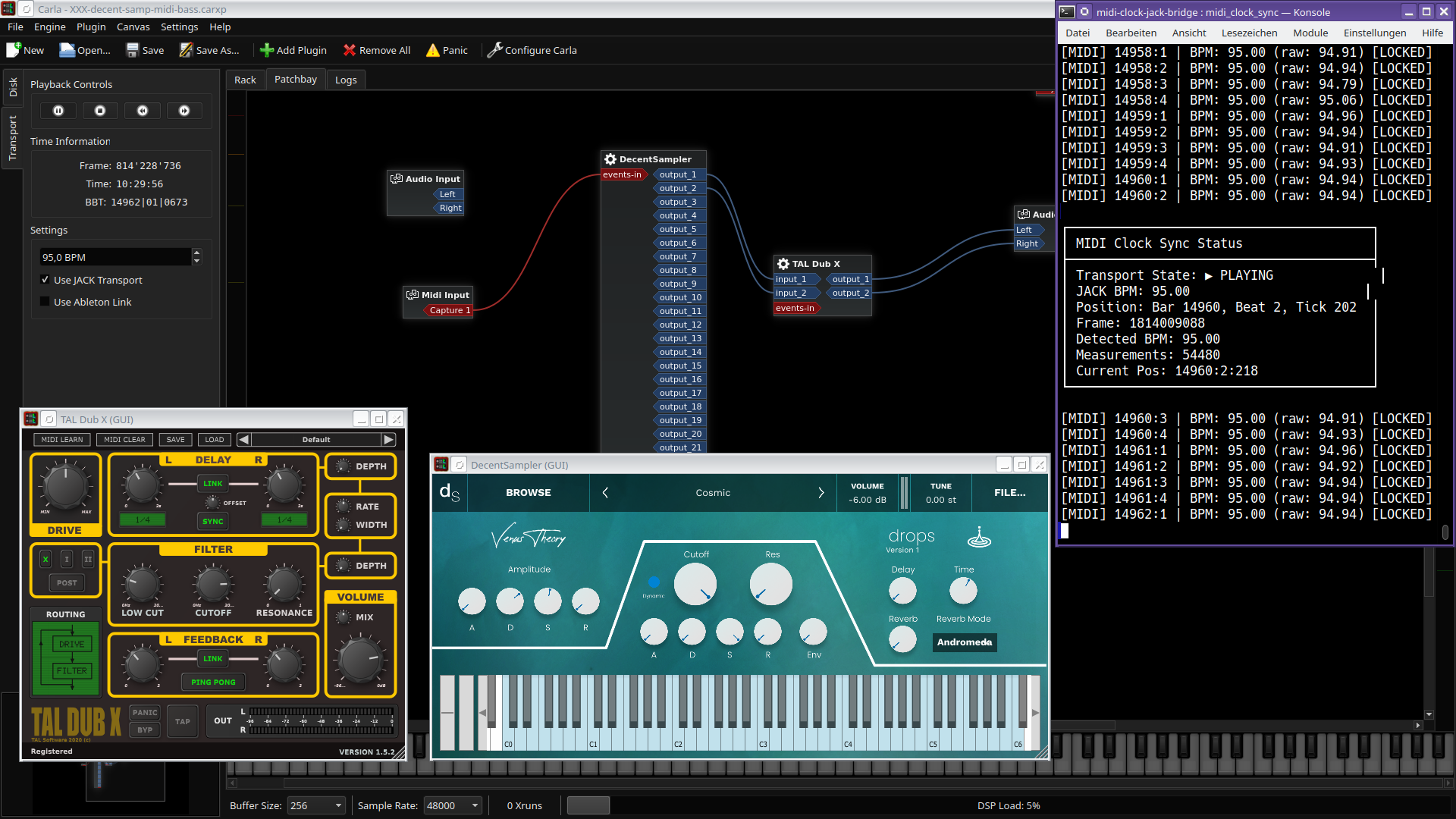 Problem: Im Plugin-Host Carla unter Linux soll ein Audio-Plugin, z.B. ein Delay synchron zu einem externen Gerät laufen, das sein Tempo per MIDI Clock kommuniziert. Carla scheint aber irgendwie mit MIDI Clock nichts anzufangen.